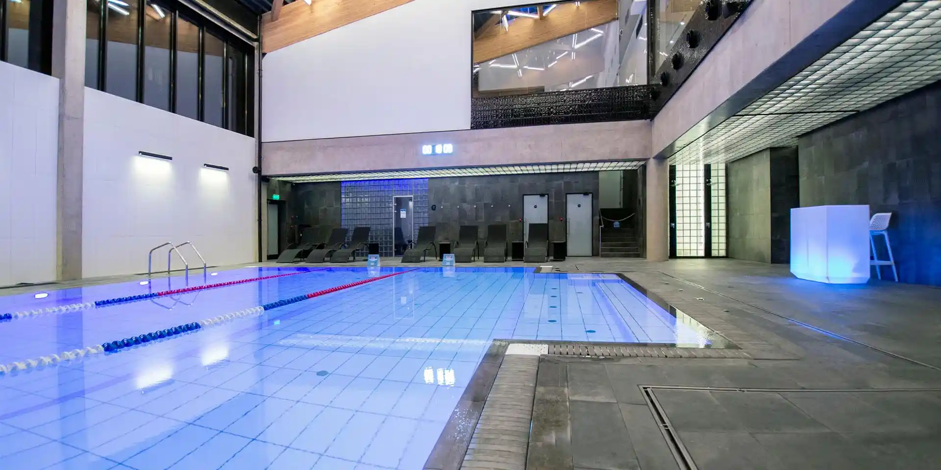 Бассейн 23×8 м оснащен самым современным оборудованием. 3-х ступенчатая очистка воды ультрафиолетом. Зона с аэромассажным плато, водопад, хаммам, подводное светодиодное освещение и музыка создают нужную атмосферу для тренировок и отдыха. Свободное плавание, аквааэробика, индивидуальные занятия на аквабайках, персональные тренировки и занятия в группах для детей и взрослых.